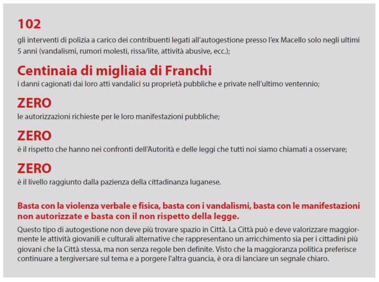 Dopo quasi un ventennio di convivenza forzata e innumerevoli illeciti commessi in tutti questi anni, è giunto il momento di dire basta. La Città di Lugano non può e non deve più tollerare sul suo territorio simili attività.